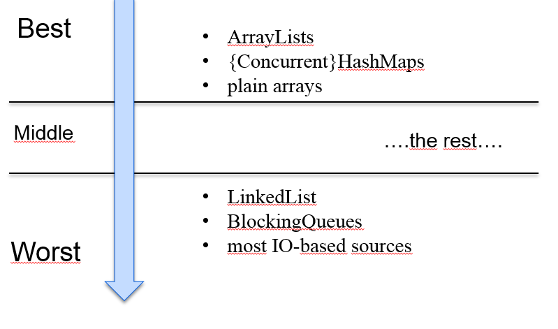 - 基础数据源无变化:从文本文件里面边读边处理的场景,不适合parallel()并行处理。parallel()一开始就容量固定的集合,这样能够平均的拆分、同步处理。