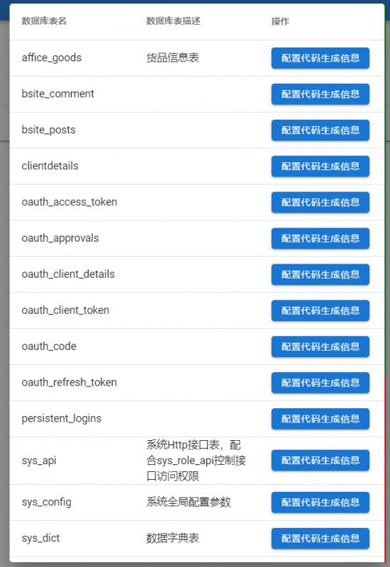 我们选择我们刚刚新建的一张表:affice_goods(为了方便测试,故意以a开头,方便查找),进行配置代码生成信息。