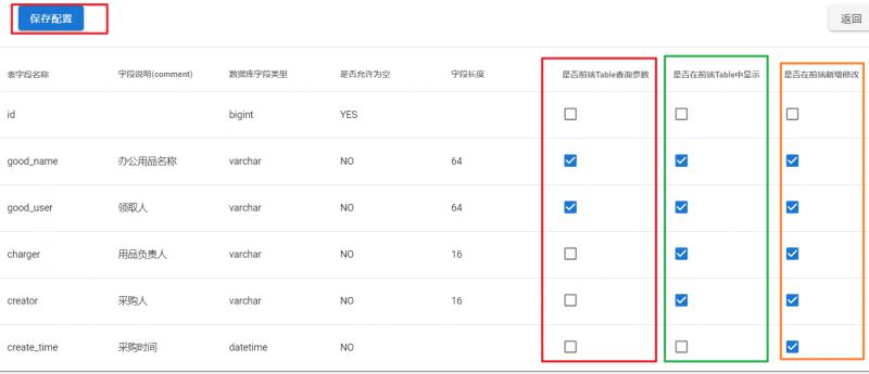- 绿色,是否在前端的table中显示,表示该字段是否作为前端table的数据展示内容出现。代码生成之后,勾选的字段将作为table数据展示列存在。(下图是代码生成之后前端展示效果)