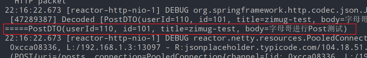 响应结果打印如下,使用PostDTO接收响应结果。因为 “http://jsonplaceholder.typicode.com/posts/1” 服务的请求数据就是响应数据。打印结果是PostDTO对象的toString()方法