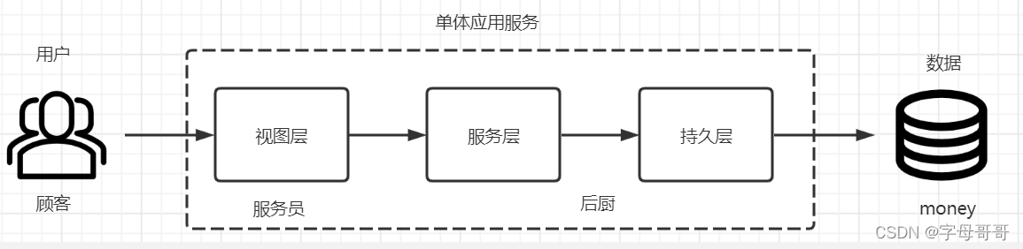 哎,别说,夫妻俩这个阶段就有点像一些软件服务创业公司,刚开始创业的时候,一般做的应用服务都是单体应用。笔者也见过一些小型创业公司上来就想搞微服务云原生,我觉得这不太现实。企业的架构都是一步一步衍进的,不要总想着一口吃一个胖子。如果京东淘宝从第一天做应用服务的时候就想做成今天的样子,他们一定活不到今天。就像一个没开过饭店的人第一次创业就要开五星级饭店,等待他的十有八九就是失败!