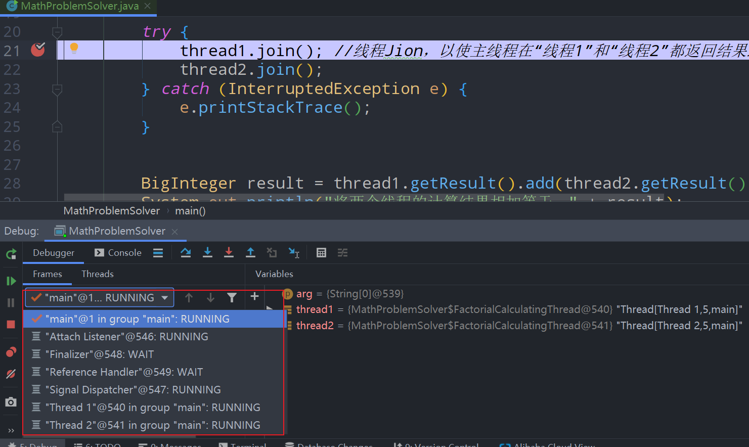 BigInteger result = thread1.getResult().add(thread2.getResult());
