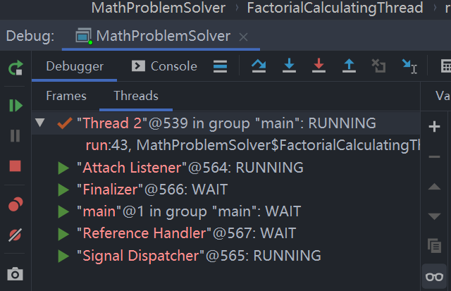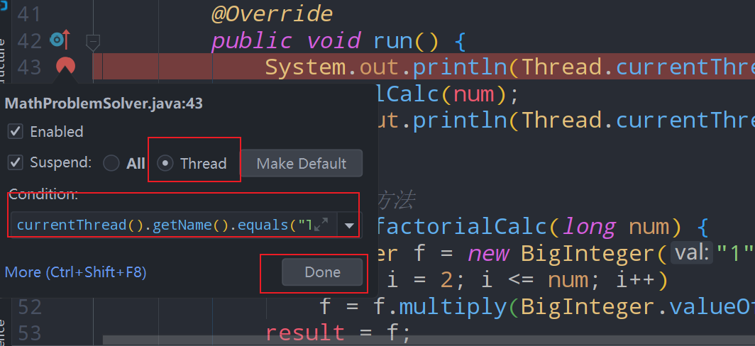 假设我正在解决该程序中的错误,并且我只需要在“Thread 2”开始运行时就暂停执行。这表明我需要在FactorialCalculatingThread的run()方法的第一行上添加一个断点。因为我们开启的两个线程使用的是同一段代码,所以我们会遇到一个问题-使用该段代码的所有线程遇到断点都将被挂起,包括应用程序的“Thread 1”和“Thread 2”。我不希望两个线程都暂停。该怎么做?