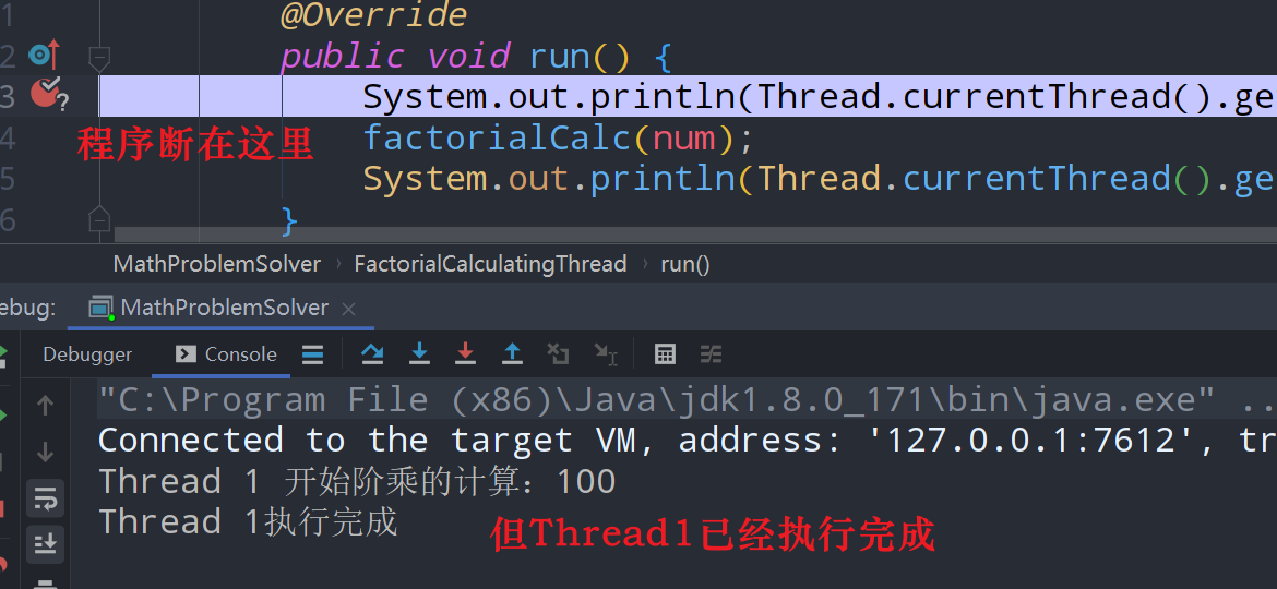 - 开启两个线程,“Thread 1”计算(100!)和“Thread 2”计算(100000!)