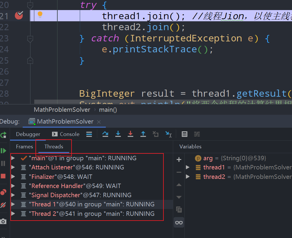 thread1.join()和thread2.join(),以使主线程在“线程1”和“线程2”都返回结果之前不会进一步执行。 - 最后将两个线程的计算结果相加,得到