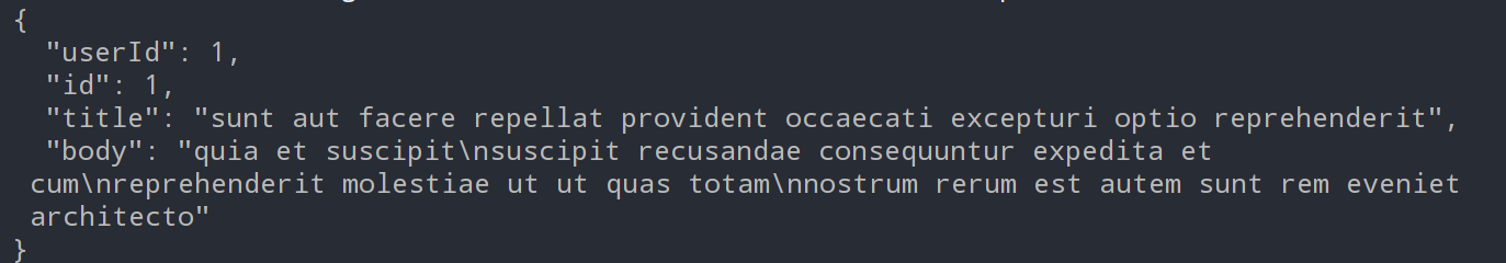服务端是JSONPlaceholder网站,帮我们提供的服务端API。需要注意的是:“http://jsonplaceholder.typicode.com/posts/1"服务URL,虽然URL里面有posts这个单词,但是它的英文含义是:帖子或者公告,而不是我们的HTTP Post协议。所以说"http://jsonplaceholder.typicode.com/posts/1”,请求的数据是:id为1的Post公告资源。打印结果如下:
