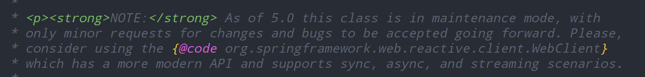 根据Spring官方文档及源码中的介绍,RestTemplate在将来的版本中它可能会被弃用,因为他们已在Spring 5中引入了WebClient作为非阻塞式Reactive HTTP客户端。但是RestTemplate目前在Spring 社区内还是很多项目的“重度依赖”,比如说Spring Cloud。另外,RestTemplate说白了是一个客户端API封装,和服务端相比,非阻塞Reactive 编程的需求并没有那么高。