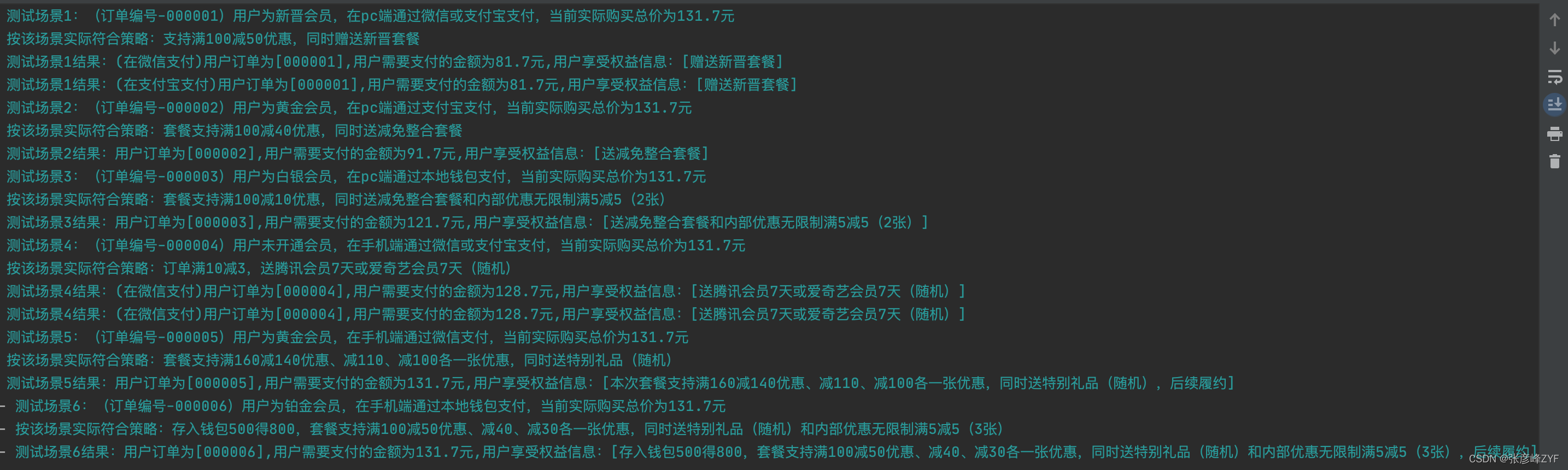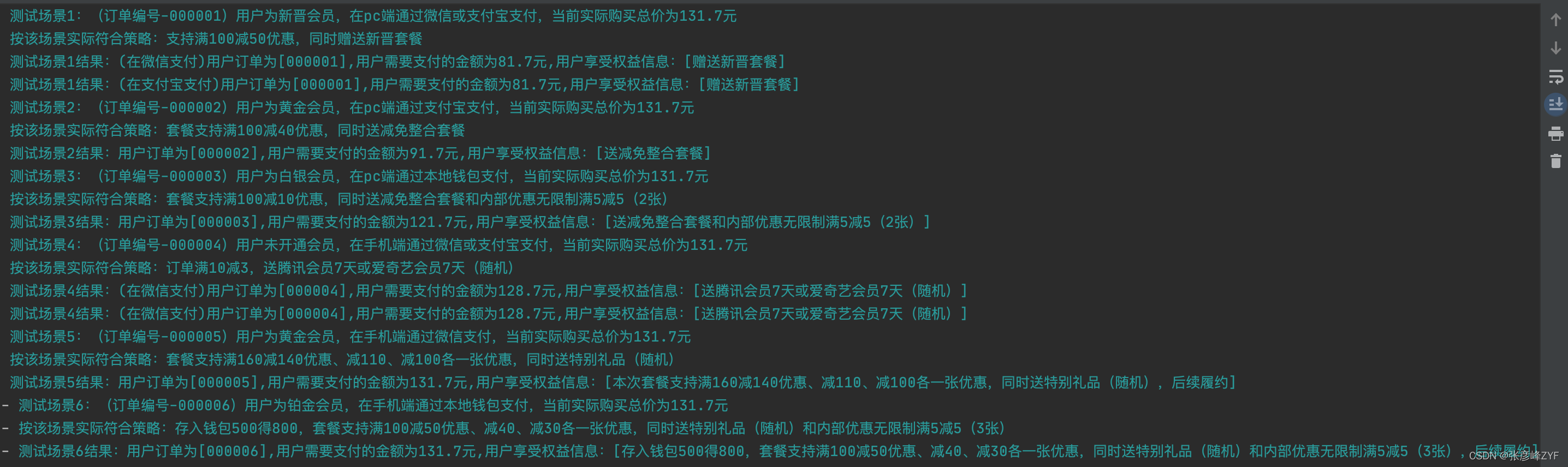 log.info("测试场景1:(订单编号-000001)用户为新晋会员,在pc端通过微信或支付宝支付,当前实际购买总价为131.7元");