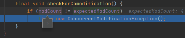 真正抛异常的地方是这个检测方法, 当modCount与expectedModCount不相等的时候直接抛出异常了。那我们要看下modCount以及expectedModCount分别是什么。这里的modCount代表ArrayList的修改次数,而expectedModCount代表的是迭代器的修改次数,在创建Itr迭代器的时候,将modCount赋值给了expectedModCount,因此在本例中一开始modCount和expectedModCount都是4(添加了四次String元素)。但是在获取到b元素之后,ArrayList进行了remove操作,因此modCount就累加为5了。因此在进行检查的时候就出现了不一致,最终导致了异常的产生。到此我们找到了抛异常的原因,循环使用迭代器进行循环,但是操作元素却是使用的ArrayList操作,因此迭代器在循环的时候发现元素被修改了所以抛出异常。