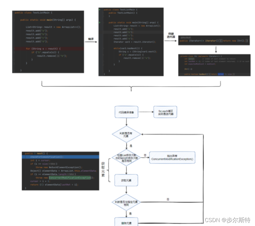 通过ArrayList创建的Itr这个内部类迭代器,于是for-each循环就转化成了迭代器加while循环的方式,原来看上去的for-each循环被挂羊头卖狗肉了。