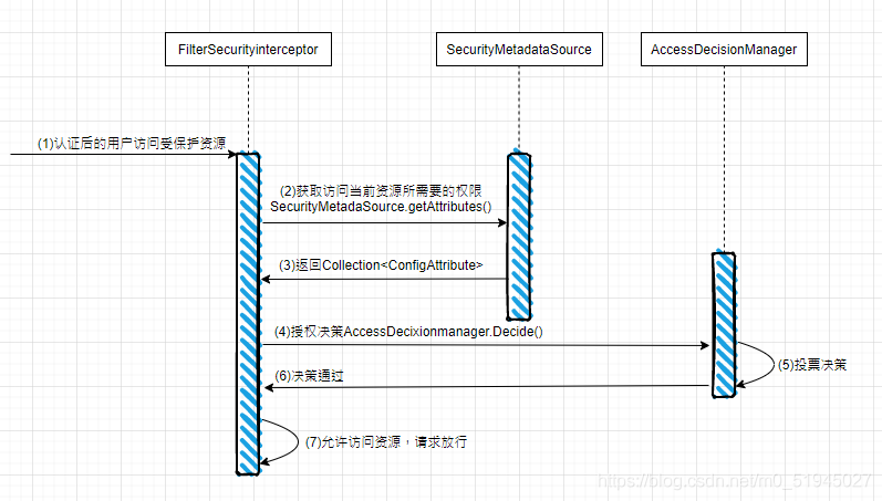 以上配置标明readAccount、findAccounts方法可匿名访问,底层使用WebExpressionVoter投票器,可从 AffirmativeBased 第23 行代码跟踪。 post方法需要有TELLER角色才能访问,底层使用RoleVoter投票器。