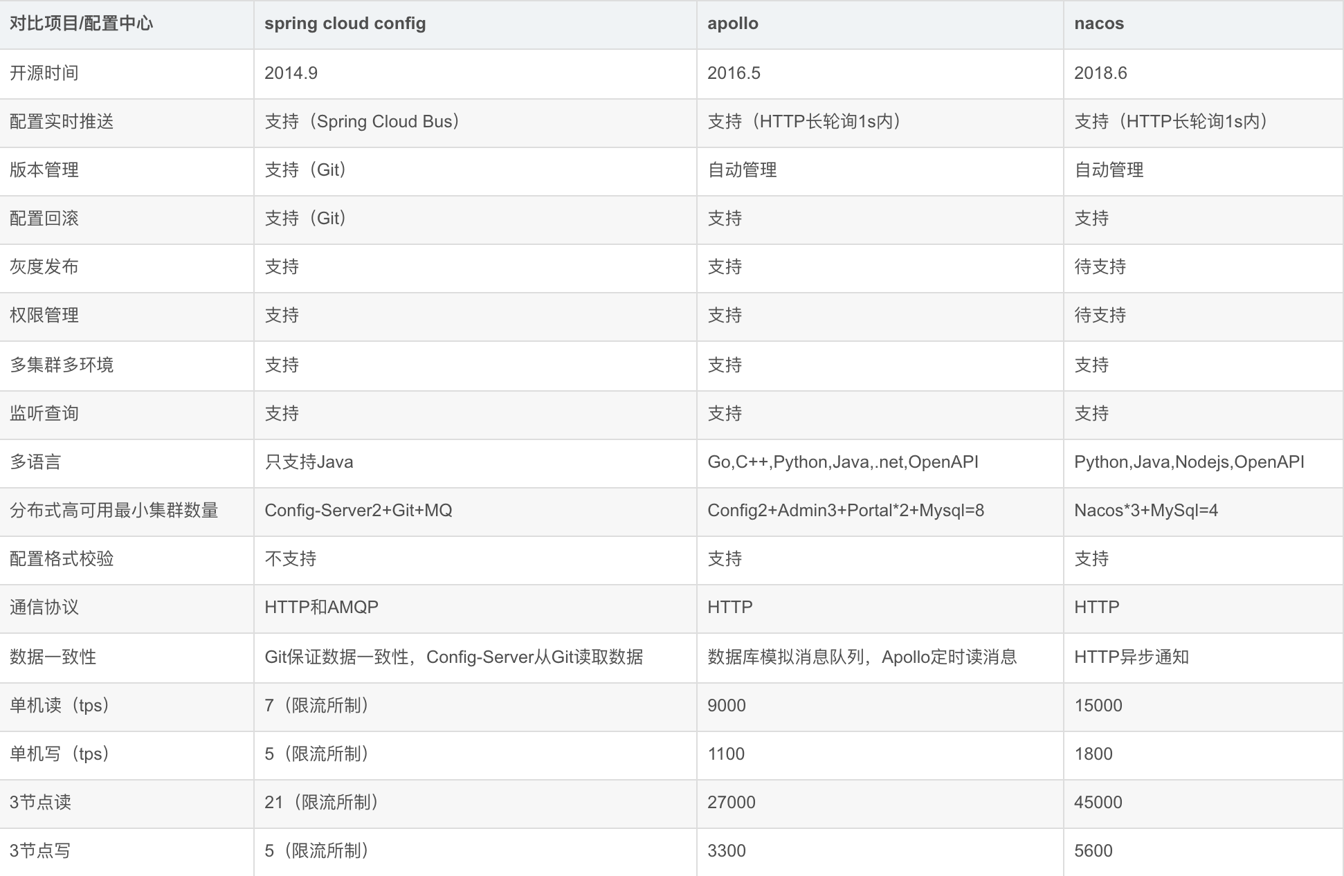 从配置中心角度来看,性能方面Nacos的读写性能最高,Apollo次之,Spring Cloud Config依赖Git场景不适合开放的大规模自动化运维API。功能方面Apollo最为完善,nacos具有Apollo大部分配置管理功能,而Spring Cloud Config不带运维管理界面,需要自行开发。