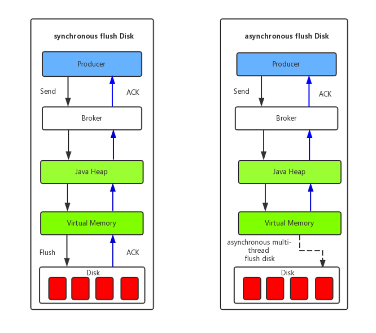 通常情况下,会把 Master和Slave 的 Broker均配置成ASYNC_FLUSH 异步刷盘方式,主从之间配置成SYNC_MASTER同步复制方式,即:异步刷盘+同步复制。