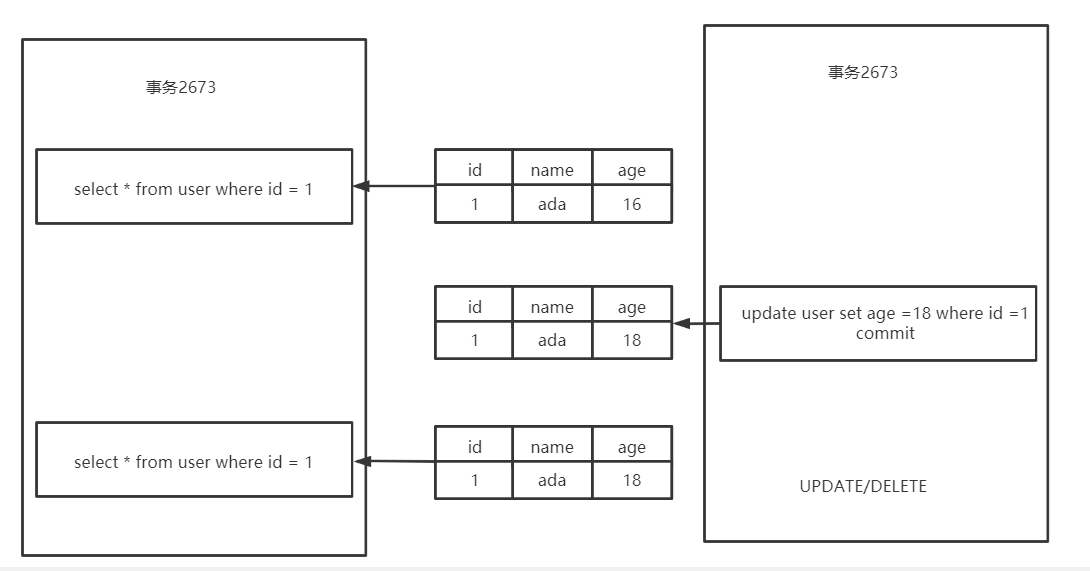 同样是两个事务,第一个事务通过id=1査询到了一条数据。然后在第二个事务里面执行了一个update操作,这里大家注意一下,执行了 update以后它通过一个commit 提交了修改。然后第一个事务读取到了其他事务已提交的数据导致前后两次读取数据不 一致的情况,就像这里,age到底是等于16还是18,那么这种一个事务读取到了其他事务已提交的数据导致前后两次读取数据不一致的情 况,我们把它叫做不可重复读。