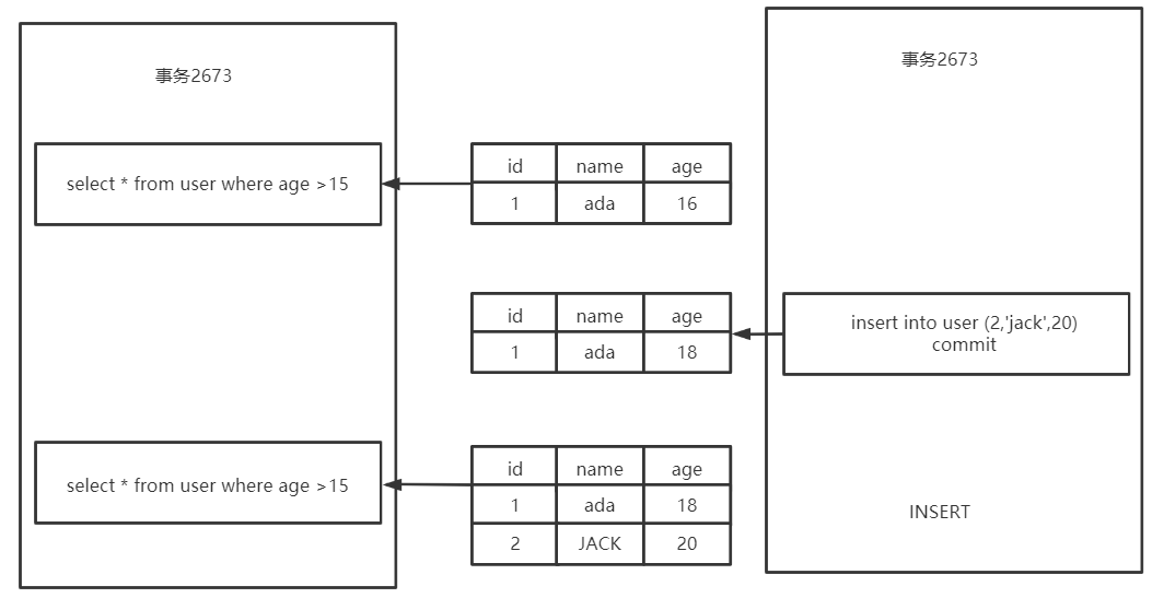 在第二个事务里面,它插入了一行数据,并且提交了。重点:插入了一行数据。在第一 个事务里面再去查询的时候,它发现多了一行数据。这种情况就好像突然冒出来的一个 幻影一样,我们把它叫做什么呢?