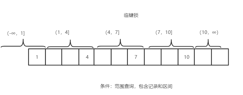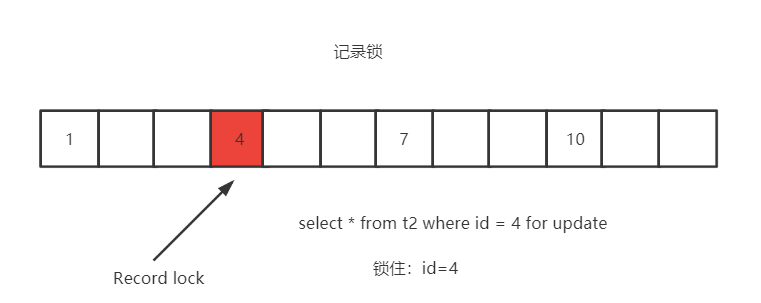 select * from t2 where id >5 and id <=7 for update;—锁住(4,7]和(7,10]