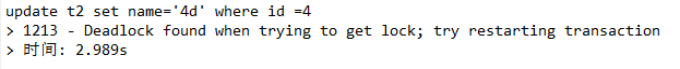 我们看到:在第一个事务中,检测到了死锁,马上退岀了,第二个事务获得了锁, 不需要等待50秒: