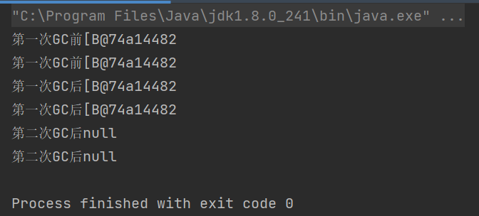 public class WeakReferenceDemo { public static void main(String[] args) throws InterruptedException { //100M的缓存数据 byte[] cacheData = new byte[100 * 1024 * 1024]; //将缓存数据用弱引用持有 WeakReference<byte[]> cacheRef = new WeakReference<>(cacheData); System.out.println("第一次GC前" + cacheData); System.out.println("第一次GC前" + cacheRef.get()); //进行一次GC后查看对象的回收情况 System.gc(); //等待GC Thread.sleep(500); System.out.println("第一次GC后" + cacheData); System.out.println("第一次GC后" + cacheRef.get()); //将缓存数据的强引用去除 cacheData = null; System.gc(); //等待GC Thread.sleep(500); System.out.println("第二次GC后" + cacheData); System.out.println("第二次GC后" + cacheRef.get()); } }这个例子演示的是我们创建一个实例,然后将数据给弱引用持有,第一次GC的时候,由于强引用还在,所以并没有回收,当我们将强引用去除后在进行GC,可以发现数据被回收了。