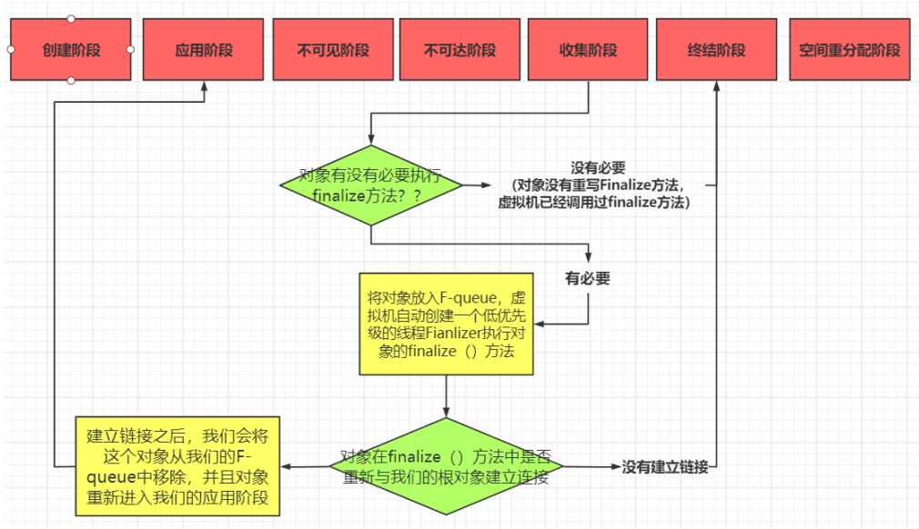 当垃圾回收器发现该对象已经处于“不可达阶段”并且垃圾回收器已经对该对象的内存空间重新分配做好准备时,则对象进入了“收集阶段”。如果该对象已经重写了 finalize() 方法,则会去执行该方法的终端操作。具体的操作可以参考下图。