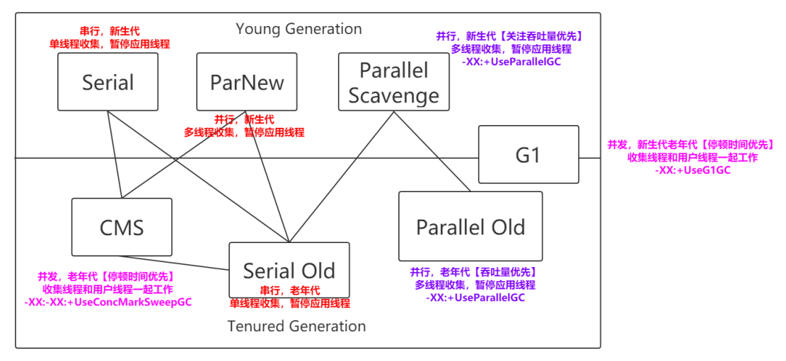 - G1:新生代老年代都处于Region集合中,无内存碎片,可以控制停顿时间。