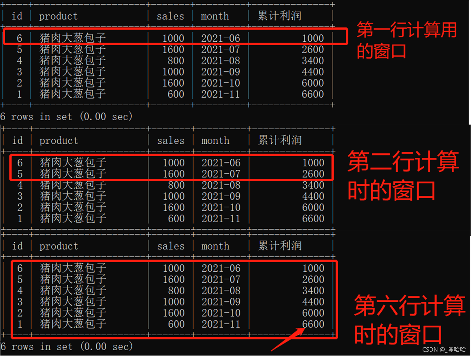 从这条SQL可以看出,对于第一行id=6这行的窗口就是第一行,对于第二行id=5这行的窗口就是前两行,以此类推(如下图)。