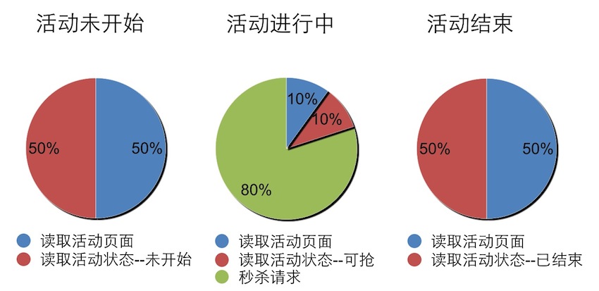 活动开始前,用户进入活动页,这个阶段有两种请求,一种是加载活动页信息,一个是查询活动状态得到未开始的结果, 一个用户进入页面两个请求各发起一次,这两种请求占比各半。