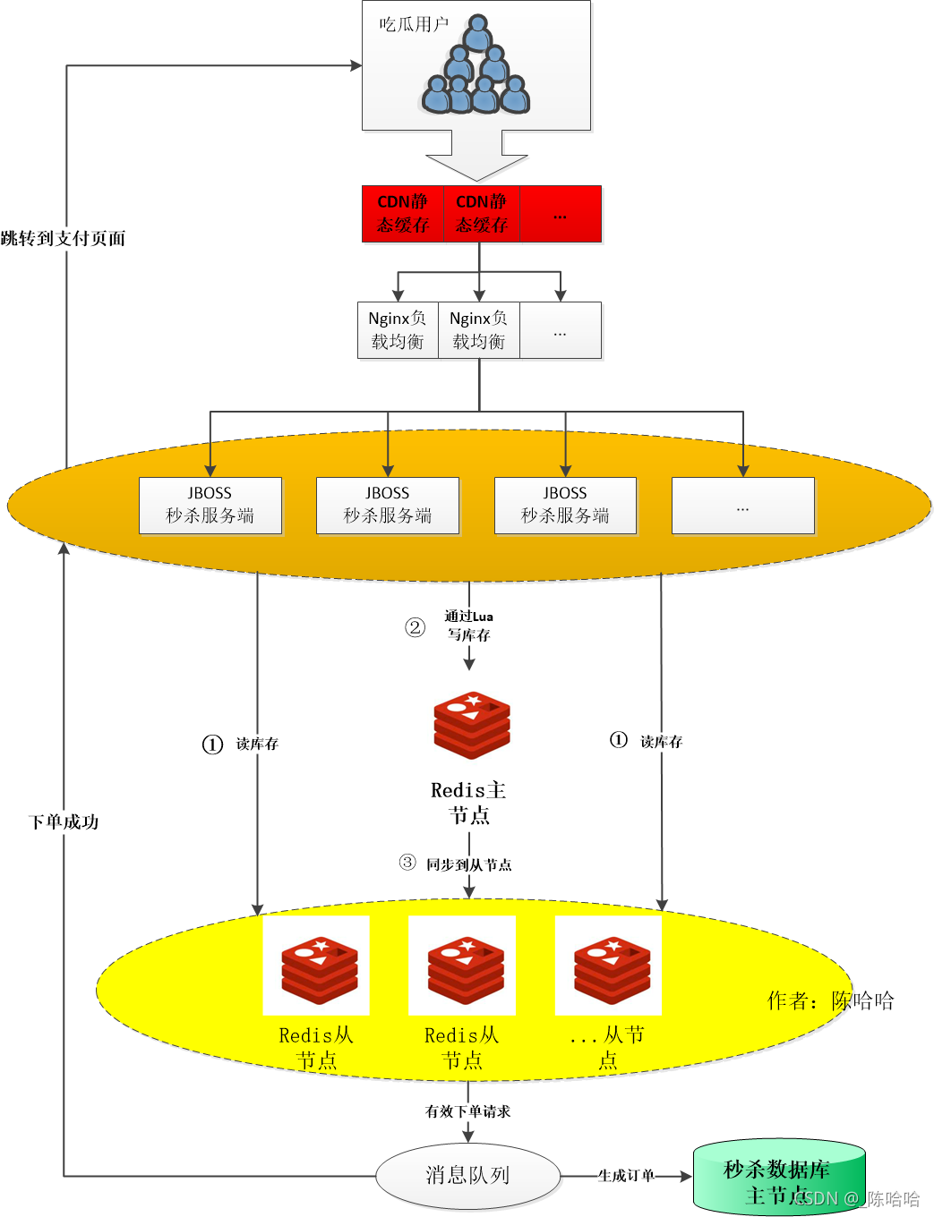 秒杀的整体架构可以概括为稳、准、快三个字,对应的分别是高可用、数据一致性、高性能。