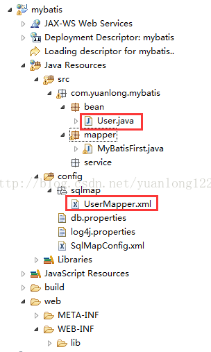 MyBatis jar官方下载地址:https://github.com/mybatis/mybatis-3/releases。关于上面提到的MyBatis所需的所有基本jar包,我已全部整理打包到一起,读者可直接去我的资源库免积分下载:3、创建log4j.properties文件在Java Resources目录下新建Source Folder,命名为config,我们可以再config里面新建log4j.properties文件。log4j.properties文件配置如下:4、创建db.properties文件# Global logging configuration log4j.rootLogger=DEBUG, stdout # MyBatis logging configuration... log4j.logger.org.mybatis.example.BlogMapper=TRACE # Console output... log4j.appender.stdout=org.apache.log4j.ConsoleAppender log4j.appender.stdout.layout=org.apache.log4j.PatternLayout log4j.appender.stdout.layout.ConversionPattern=%5p [%t] - %m%n为了方便管理和修改数据库连接信息,我们将数据库连接信息集中编写在db.properties文件中。在前面新建的config下创建db.properties文件,db.properties配置如下(我的MySql端口是3333,读者根据自己实际情况进行端口等信息的配置):5、创建MyBatis全局配置文件SqlMapConfig.xml文件db.driver=com.mysql.jdbc.Driver db.url=jdbc:mysql://localhost:3333/mybatis?useUnicode=true&characterEncoding=UTF-8 db.username=yuanlong_mybatis db.password=yuanlong在config下创建SqlMapConfig.xml配置文件,配置如下:<?xml version="1.0" encoding="UTF-8" ?> <!DOCTYPE configuration PUBLIC "-//mybatis.org//DTD Config 3.0//EN" "http://mybatis.org/dtd/mybatis-3-config.dtd"> <configuration> <!-- 加载连接池配置文件(此处将之前创建的db.properties数据库连接文件引入) --> <properties resource="db.properties" /> <!-- 配置MyBatis的环境信息(注意:MyBatis和Spring整合后,该环境信息将由Spring来管理,也就是将不再需要配置下面这段话) --> <environments default="development"> <environment id="development"> <!-- 配置JDBC事务管理 --> <transactionManager type="JDBC"></transactionManager> <!-- 配置数据源(数据库连接池) --> <dataSource type="POOLED"> <property name="driver" value="${db.driver}" /> <property name="url" value="${db.url}" /> <property name="username" value="${db.username}" /> <property name="password" value="${db.password}" /> </dataSource> </environment> </environments> <!-- 注意:此处引入的是MyBatis映射文件,映射文件的创建在下面介绍 --> <mappers> <mapper resource="sqlmap/User.xml" /> <mapper resource="sqlmap/UserMapper.xml" /> </mappers> </configuration>