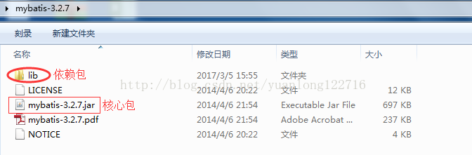 MyBatis需导入的基本jar包可以分为3类:核心包、依赖包、数据库驱动包(MySql或Oracle)。下载完MyBatis jar文件后解压打开如下图所示,其中mybatis-3.2.7.jar为核心包,lib下存放的全部为依赖包,复制mybatis-3.2.7.jar以及lib下的所有jar包,粘贴到eclipse项目lib目录下。另外,因为MyBatis是持久层框架,用来操作数据库,所以我们还需要MySql的数据库驱动包。