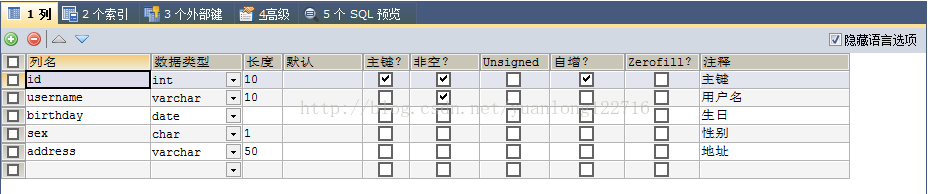 (1).MyBatis是操作数据库的持久层框架,为了学习MyBatis我们应该首先创建表(当然关于MySql数据库的安装什么的,还没安装的同学自己百度哦),此处学习我们新建User表如下:(2).在bean包下新建与User表对应的bean类User.java(MyBatis提供逆向工程机制,关于逆向工程在后续文章中讲解,此处先手动新建类)。User.java:(4).在config目录下新建sqlmap包,在sqlmap中新建User类对应的映射文件,命名为UserMapper.xml(Mybatis映射文件的习惯命名方式)。package com.yuanlong.mybatis.bean; import java.util.Date; public class User { private Integer id; private String username; private Date birthday; private String sex; private String address; public Integer getId() { return id; } public void setId(Integer id) { this.id = id; } public String getUsername() { return username; } public void setUsername(String username) { this.username = username; } public Date getBirthday() { return birthday; } public void setBirthday(Date birthday) { this.birthday = birthday; } public String getSex() { return sex; } public void setSex(String sex) { this.sex = sex; } public String getAddress() { return address; } public void setAddress(String address) { this.address = address; } @Override public String toString() { return "User [id=" + id + ", username=" + username + ", birthday=" + birthday + ", sex=" + sex + ", address=" + address + "]"; } }UserMapper.xml:(5).自定义测试类 MyBatisFirst.java<?xml version="1.0" encoding="UTF-8"?> <!DOCTYPE mapper PUBLIC "-//mybatis.org//DTD Mapper 3.0//EN" "http://mybatis.org/dtd/mybatis-3-mapper.dtd"> <mapper namespace="user"> <select id="findUserById" parameterType="java.lang.Integer" resultType="com.yuanlong.mybatis.bean.User"> SELECT * FROM USER WHERE id = #{id} </select> <select id="findUserByName" parameterType="java.lang.String" resultType="com.yuanlong.mybatis.bean.User"> SELECT * FROM USER WHERE username LIKE '%${value}%' </select> <insert id="insertUser" parameterType="com.yuanlong.mybatis.bean.User"> INSERT INTO user(username,birthday,sex,address) VALUE(#{username},#{birthday},#{sex},#{address}) </insert> <delete id="deleteUser" parameterType="java.lang.Integer"> DELETE FROM USER WHERE id=#{id} </delete> <update id="updateUser" parameterType="com.yuanlong.mybatis.bean.User"> UPDATE USER SET username=#{username}, birthday=#{birthday}, sex=#{sex}, address=#{address} WHERE id=#{id} </update> </mapper>package com.yuanlong.mybatis.mapper; import java.io.IOException; import java.io.InputStream; import java.text.DateFormat; import java.text.ParseException; import java.text.SimpleDateFormat; import java.util.Date; import java.util.List; import org.apache.ibatis.io.Resources; import org.apache.ibatis.scripting.xmltags.SetSqlNode; import org.apache.ibatis.session.SqlSession; import org.apache.ibatis.session.SqlSessionFactory; import org.apache.ibatis.session.SqlSessionFactoryBuilder; import org.junit.Test; import com.yuanlong.mybatis.bean.User; /** * 原始Dao开发方法 * */ public class MyBatisFirst { public void findUserById() throws IOException{ InputStream inputStream = null; SqlSessionFactory sqlSessionFactory = null; SqlSession sqlSession = null; try { //MyBatis配置文件 String resources = "SqlMapConfig.xml"; //构造输入流 inputStream = Resources.getResourceAsStream(resources); //构建sqlSessionFactory sqlSessionFactory = new SqlSessionFactoryBuilder().build(inputStream); //获取SqlSession sqlSession = sqlSessionFactory.openSession(); //SqlSession是面向我们程序员的接口 //selectOne方法的第一个参数是XML文件中的namespace.id,第二个参数是传入的参数值(parameterType) User user = (User)sqlSession.selectOne("user.findUserById",1); //打印 if(user!=null){ System.out.println(user); } } catch (Exception e) { e.printStackTrace(); } finally { //释放sqlSession sqlSession.close(); } } public void findUserByName() throws IOException{ InputStream inputStream = null;//输入流 SqlSessionFactory sqlSessionFactory = null;//会话工厂 SqlSession sqlSession = null;//会话 try { //MyBatis配置文件 String resource = "SqlMapConfig.xml"; inputStream = Resources.getResourceAsStream(resource); //构造输入流 sqlSessionFactory = new SqlSessionFactoryBuilder().build(inputStream);//会话工厂 sqlSession = sqlSessionFactory.openSession();//会话 List<User> list = sqlSession.selectList("user.findUserByName","源"); for(User user:list){ System.out.println(user.getSex()); } } catch (Exception e) { e.printStackTrace(); } finally { sqlSession.close(); } } @Test public void insertUser() throws IOException, ParseException{ InputStream inputStream = null; SqlSessionFactory sqlSessionFactory = null; SqlSession sqlSession = null; try { //MyBatis配置文件 String resource = "SqlMapConfig.xml"; //输入流 inputStream = Resources.getResourceAsStream(resource); //会话工厂 sqlSessionFactory = new SqlSessionFactoryBuilder().build(inputStream); //会话 sqlSession = sqlSessionFactory.openSession(); User user = new User(); user.setUsername("原晖"); DateFormat dateFormat = new SimpleDateFormat("yyyy-MM-dd"); Date date = dateFormat.parse("1997-05-29"); user.setBirthday(date); user.setSex("男"); user.setAddress("甘肃省天水市甘谷县磐安"); //sqlSession是面向程序员的接口 sqlSession.insert("user.insertUser1", user); sqlSession.commit(); //获取新增记录自动生成的主键 System.out.println("insert操作执行之后,获取到insert时自动生成的主键id值为:"+user.getId()); } catch (Exception e) { e.printStackTrace(); } finally { sqlSession.close(); } } public void deleteUser() throws IOException{ InputStream inputStream = null; SqlSessionFactory sqlSessionFactory = null; SqlSession sqlSession = null; try { //MyBatis配置文件 String resource = "SqlMapConfig.xml"; //输入流 inputStream = Resources.getResourceAsStream(resource); //会话工厂 sqlSessionFactory = new SqlSessionFactoryBuilder().build(inputStream); //会话 sqlSession = 