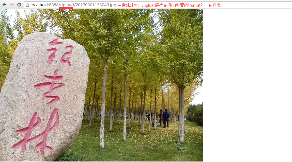 假设我们现在已经成功上传文件(比如一张图片)到"F:/springUpload"文件夹,那么按照上面的配置,我们访问Tomcat的相对应目录,应该也能访问到该图片(实际就是将一张图片同时存储在了两个位置)。