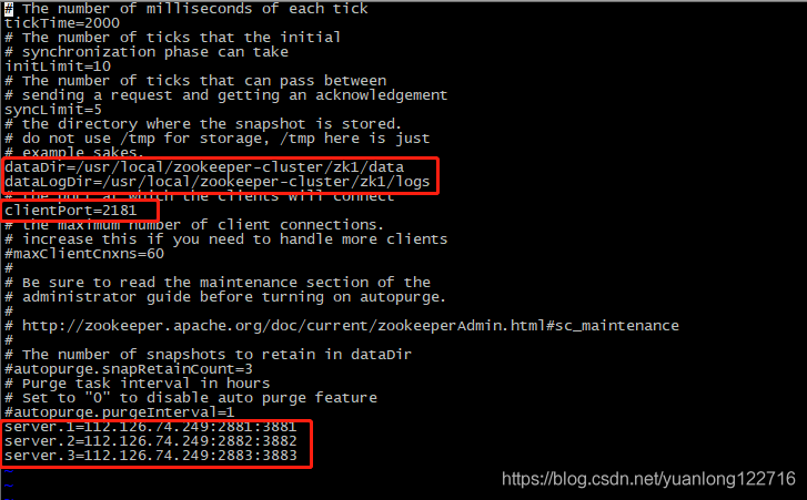 # vi zoo.cfg ① 修改:dataDir=/usr/local/zookeeper-cluster/zk1/data