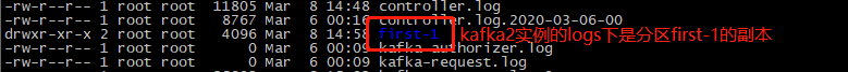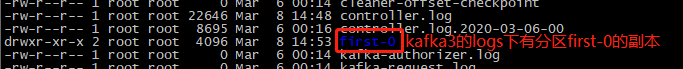 可以看到,logs下有两个目录:first-0、first-1,这就是我们创建的topic的两个分区(我们定义的分区副本是2,这是分区0和1的其中一个副本),