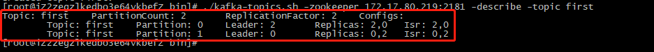 # ./kafka-topics.sh -zookeeper 172.17.80.219:2181 -describe -topic first