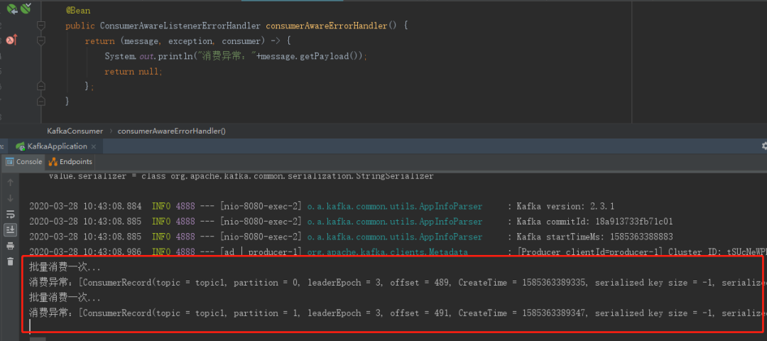 新建一个 ConsumerAwareListenerErrorHandler 类型的异常处理方法,用@Bean注入,BeanName默认就是方法名,然后我们将这个异常处理器的BeanName放到@KafkaListener注解的errorHandler属性里面,当监听抛出异常的时候,则会自动调用异常处理器,