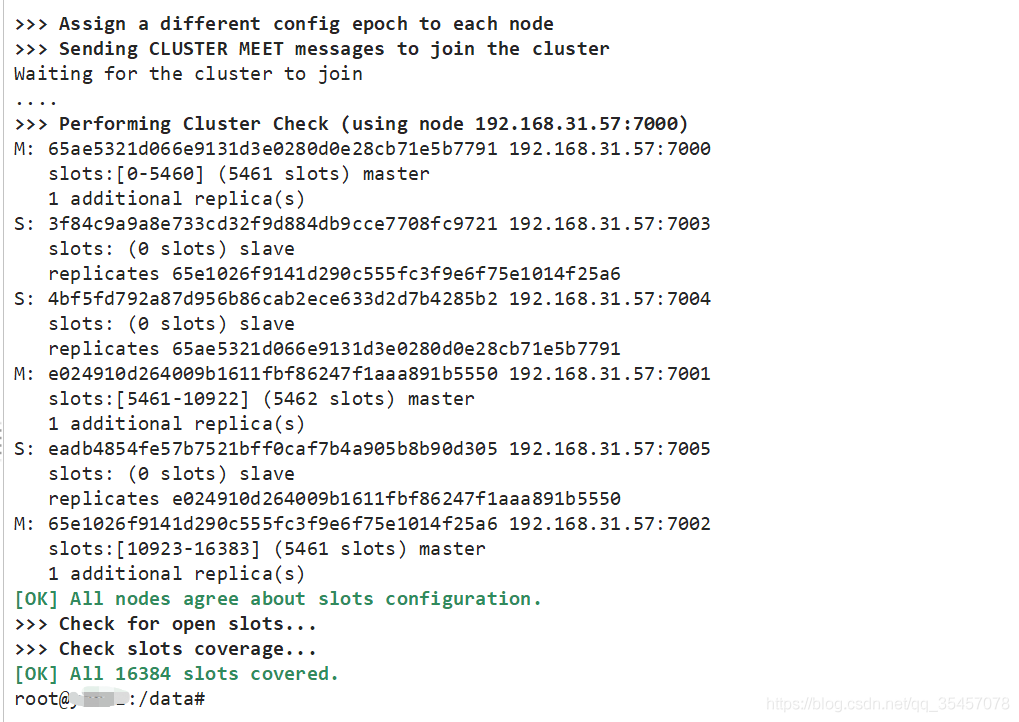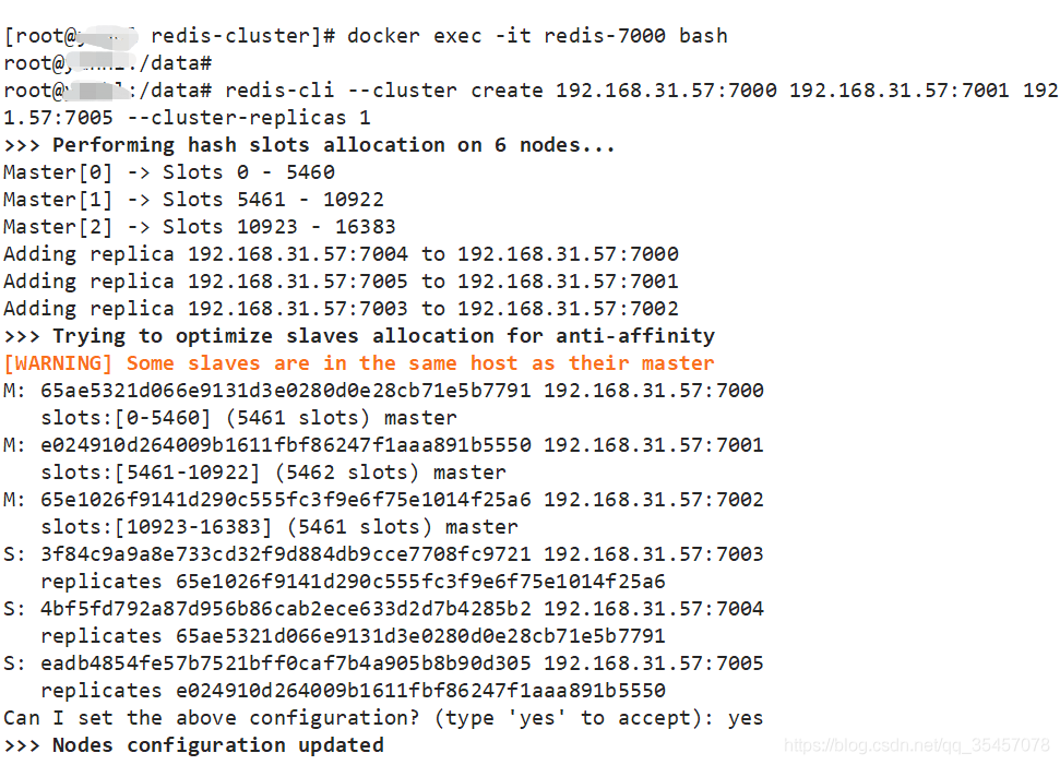 redis-cli --cluster create 192.168.31.57:7000 192.168.31.57:7001 192.168.31.57:7002 192.168.31.57:7003 192.168.31.57:7004 192.168.31.57:7005 --cluster-replicas 1
