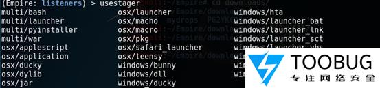 然后我们利用是 usestager,来搞事情!这个模块可生成 Linux、mac os、windows 的多种木马,用于反弹 shell。