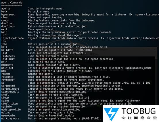 其实我最关注的是 bypassuac(提权模块)、dowanload 下载文件、mimikatz 获取 hash、upload上传文件、usemodule 使用 powershell moudle(类似于 metasploit 的 exp 中的 rb 文件,很强大)、shell+command 执行 cmd 命令。 injectshellcode 注入某些进程 shellcode。