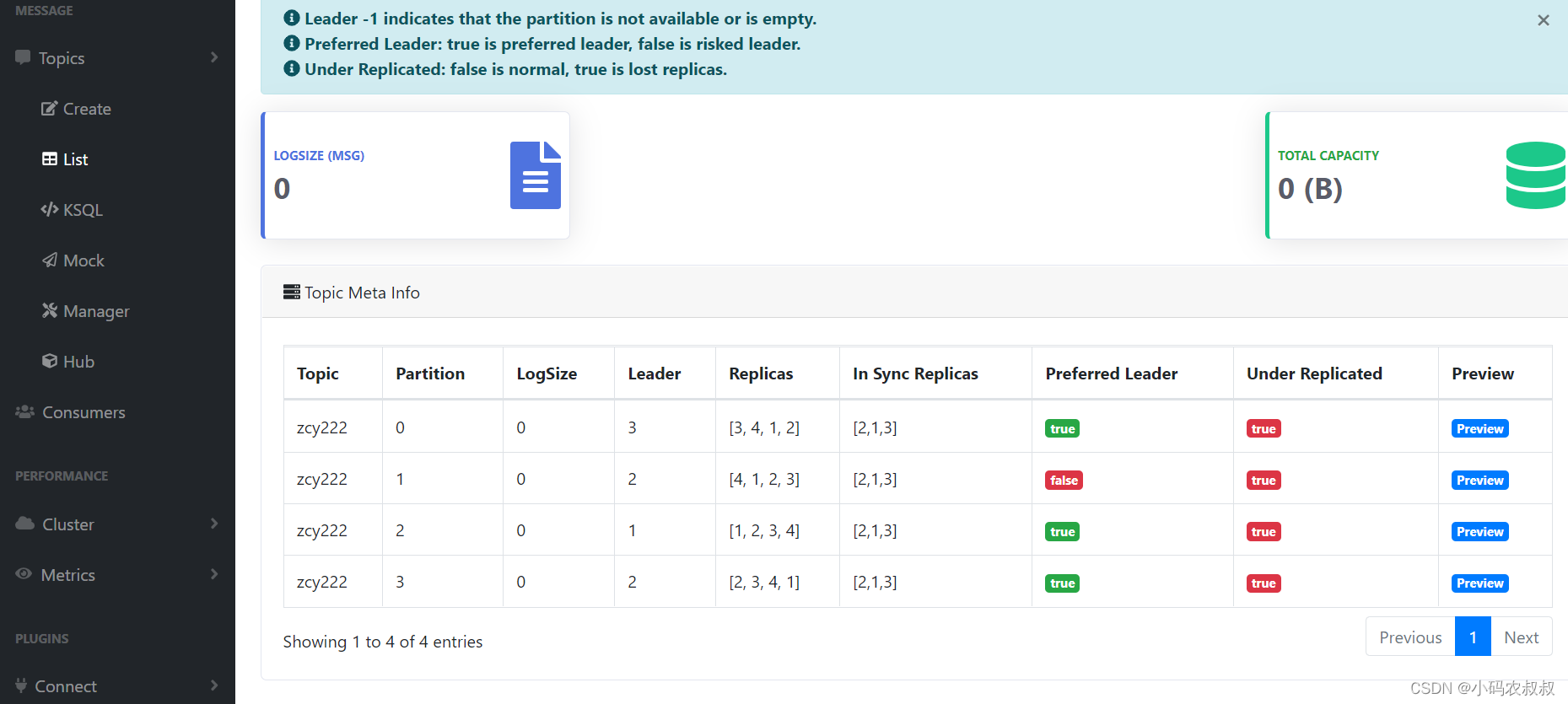 登录成功后,来到如下的页面,可以很方便的看到之前我们在集群中创建的各个topic,比如集群中有几个broker,几个topic,连接的zk信息,某个topic的分区、副本数,isr情况,甚至可以直接通过可视化界面像之前使用命令那样创建topic等,这里就不再一一赘述了,有兴趣的同学可以自行操作感受一下