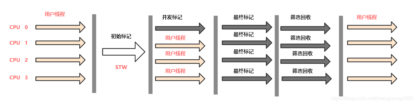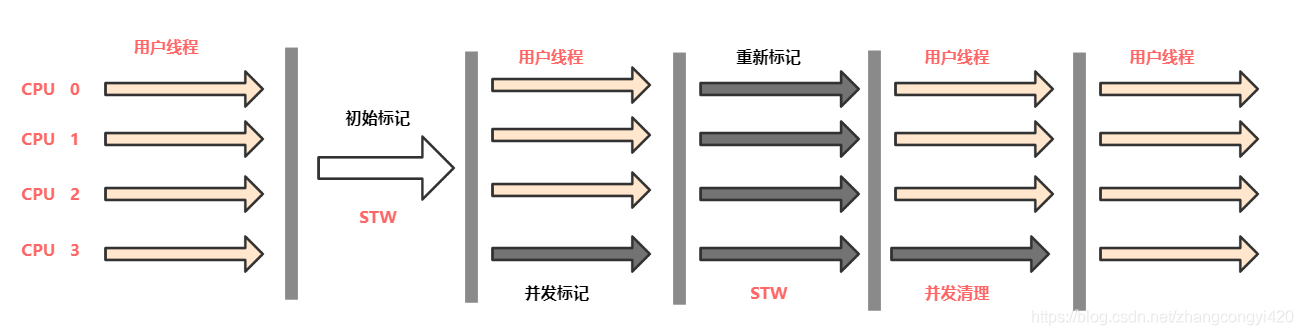 从上图中我们发现,CMS垃圾回收器在执行一次完整的垃圾回收时要经历几个阶段:初始标记(会产生一个很短的STW) ,并发标记,重新标记,并发清理,对其中的几个关键点做简单的说明: