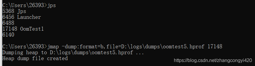 jmap -dump:format=b,file=D:\logs\dumps\oomtest5.hprof 17148