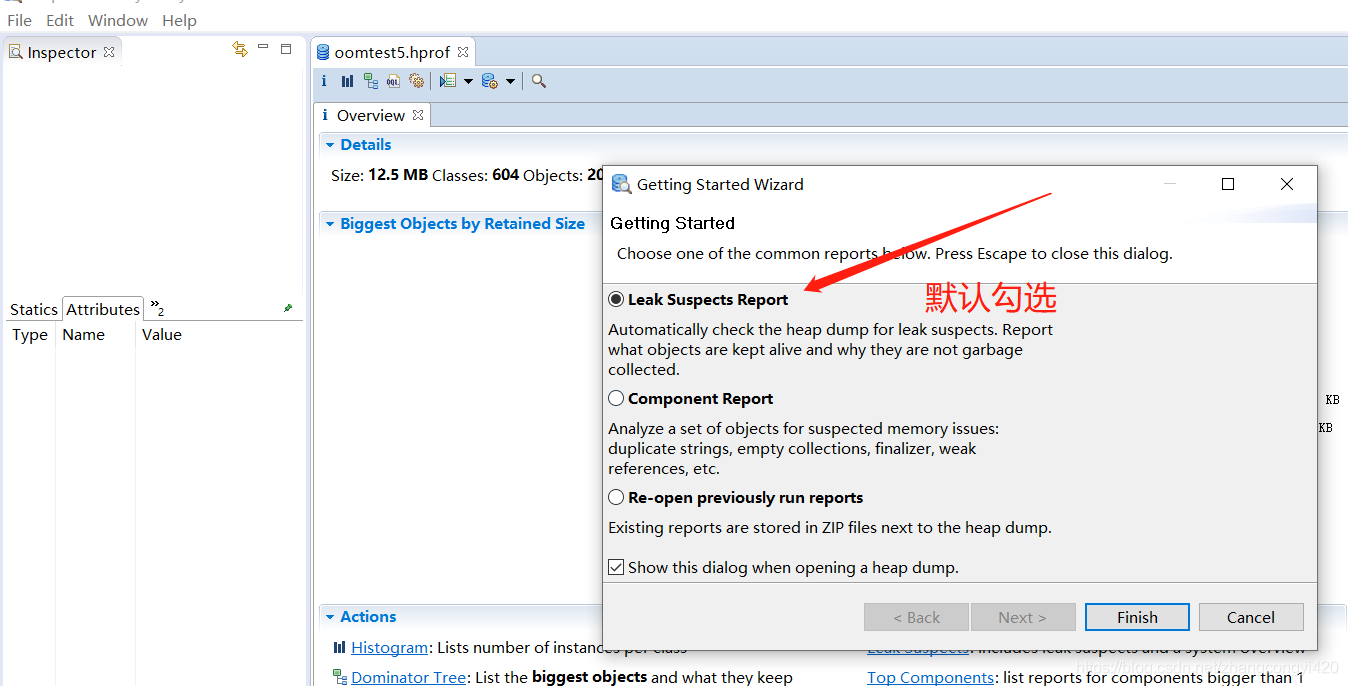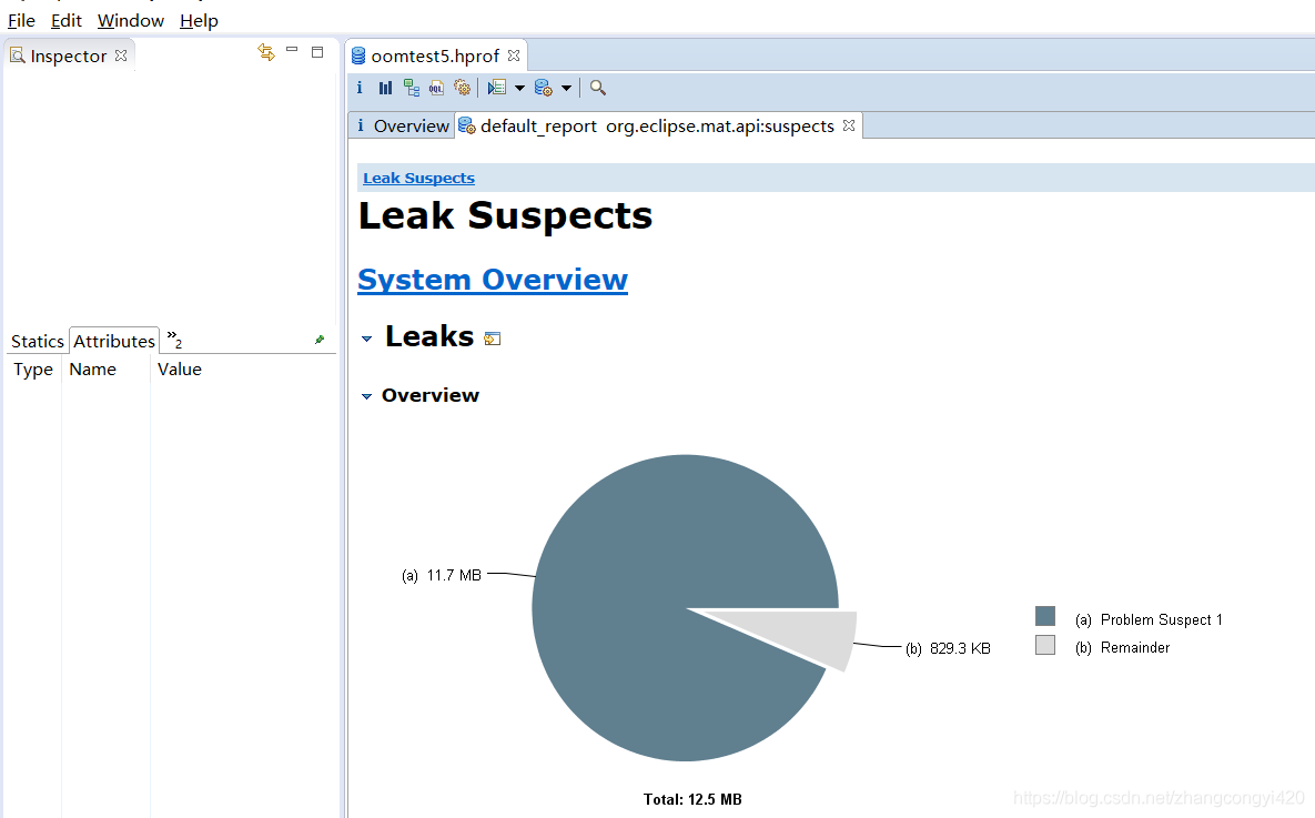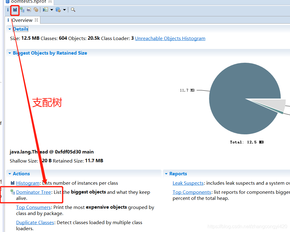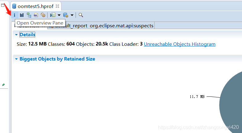 OverView功能是导入了dump文件之后,对可能出现的问题做了一个整体性的分析概述,首先呈现在眼前的是以一个形状图的方式,快速展现了该文件中dump文件大小,以及类、对象和类加载器的数量