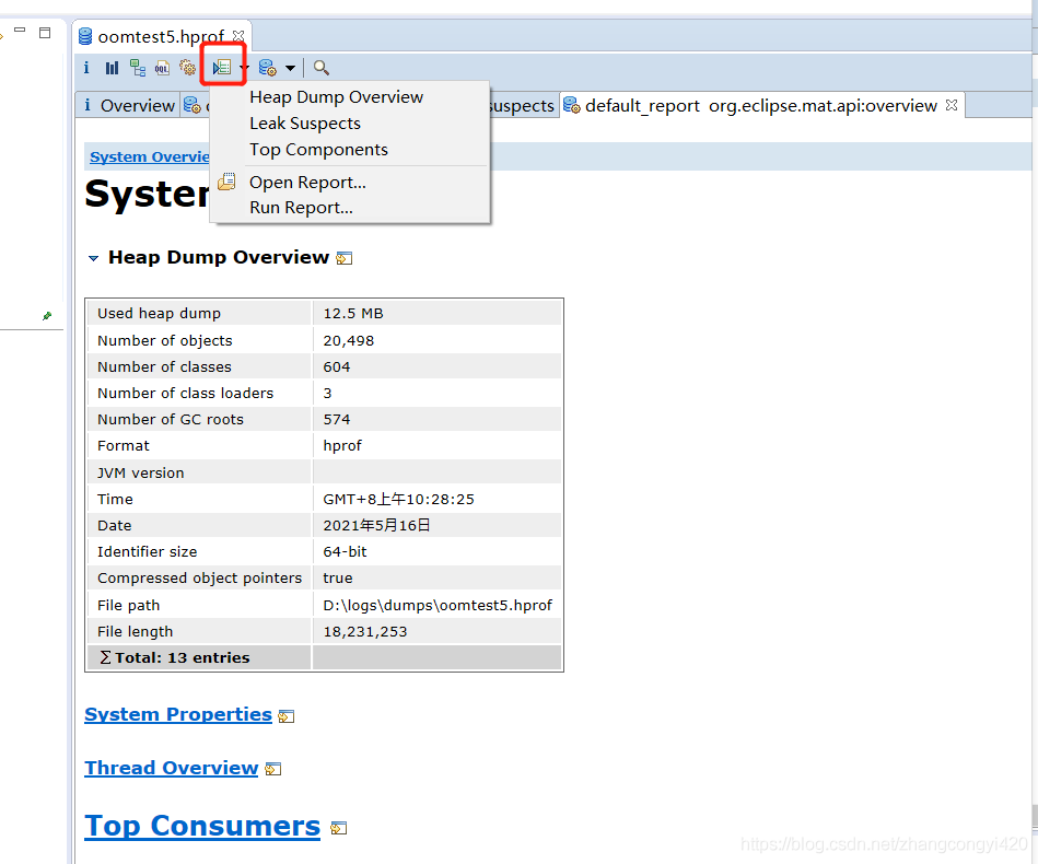 分析报告,点击此处,可以查看dump文件的各类参数报告