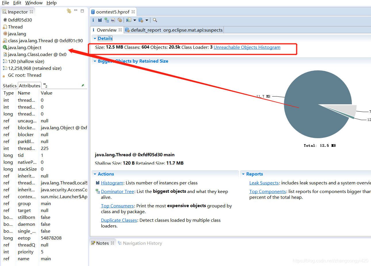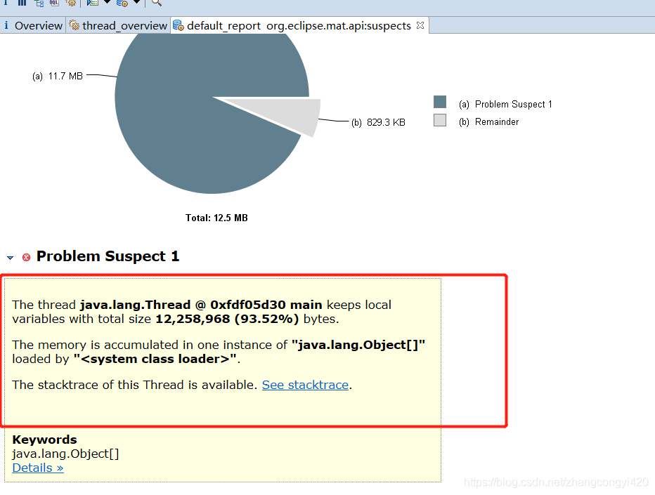 从开始的leak suspects中,也给出了初步的判断,报告说的是在main线程中,有一个对象的大小占据了堆内存的大小的93%,说明在当前这一时刻,某个对象有可能成为OOM的原因