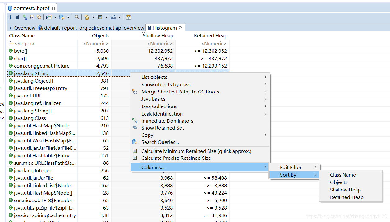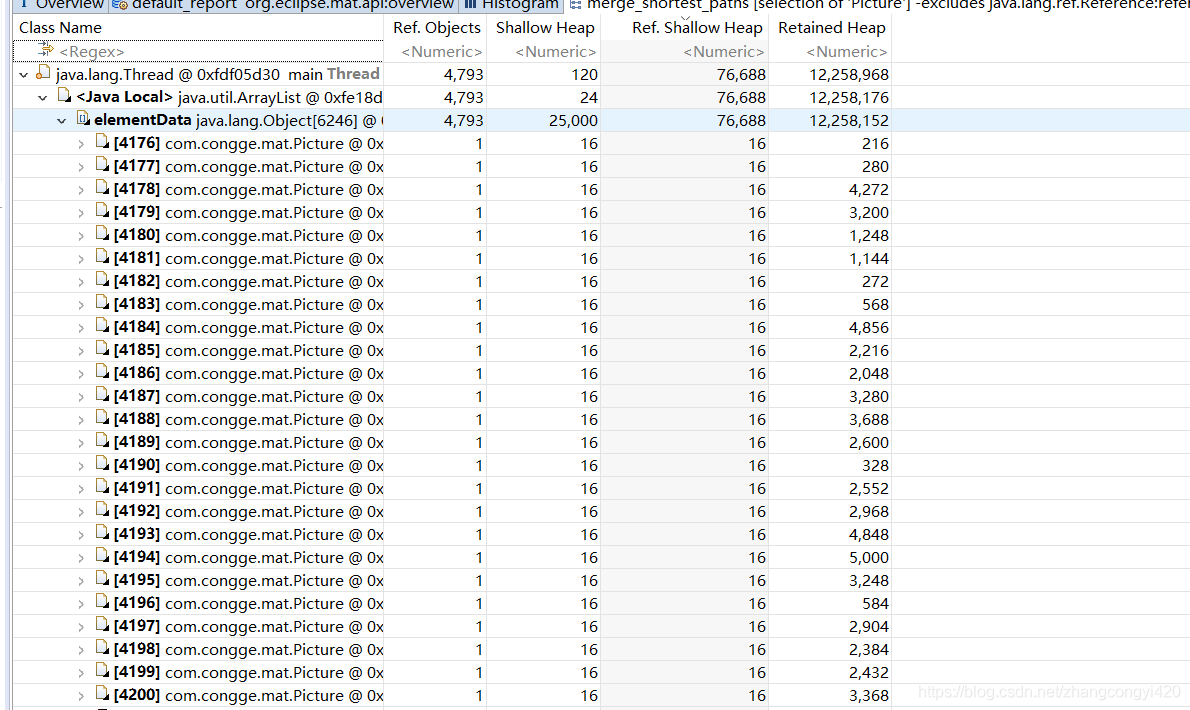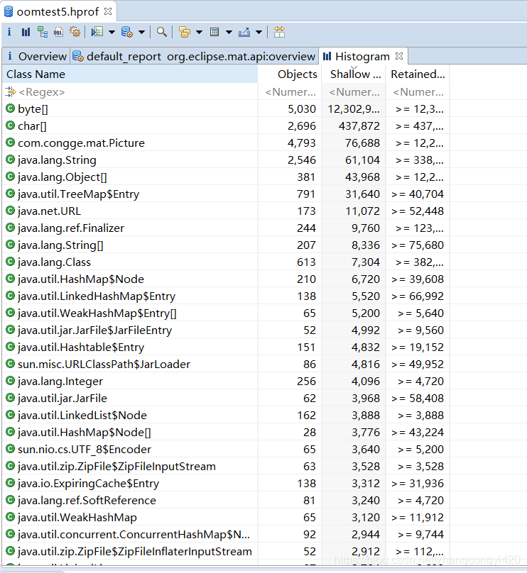 当点击进去之后,为我们呈现出dump文件中,已经创建的主要的对象信息,默认按照对象的个数进行排序,而这个排序,多少也反映出在当前的dump文件中,那些排在前面的数量最多的对象可能是我们分析问题的关键入口