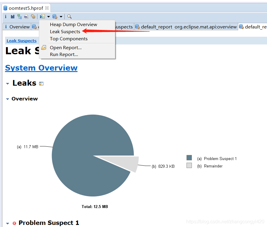 在该菜单下,另一个比较好用的就是这个Leak Suspects功能,MAT分析工具会根据你导入的dump文件,快速生成一份怀疑报告,将可能出现内存泄露的点展示出来,便于开发或运维人员进行问题定位