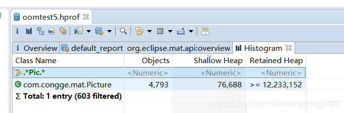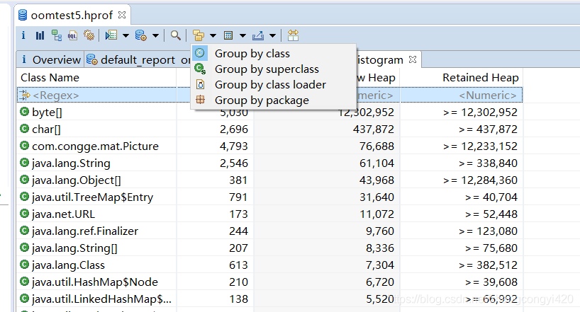 以Heap Dump Overview为例,以表格的形式呈现出当前的dump文件中,已创建的对象个数,class的格式,类加载器的个数等,反应的是一个概览信息