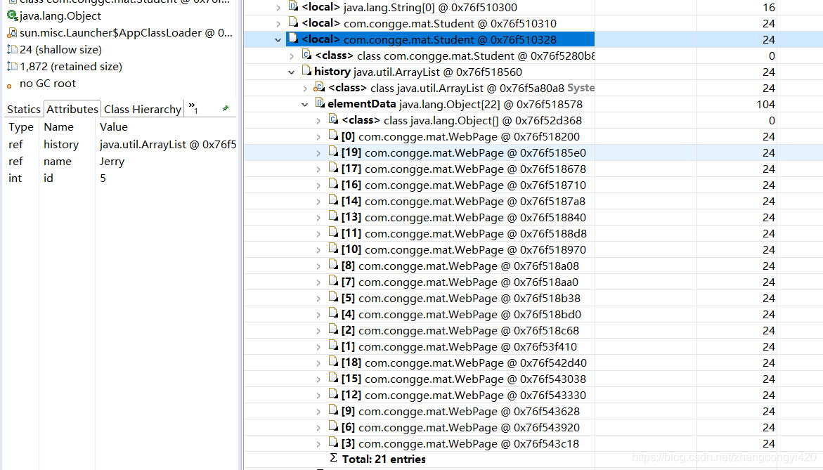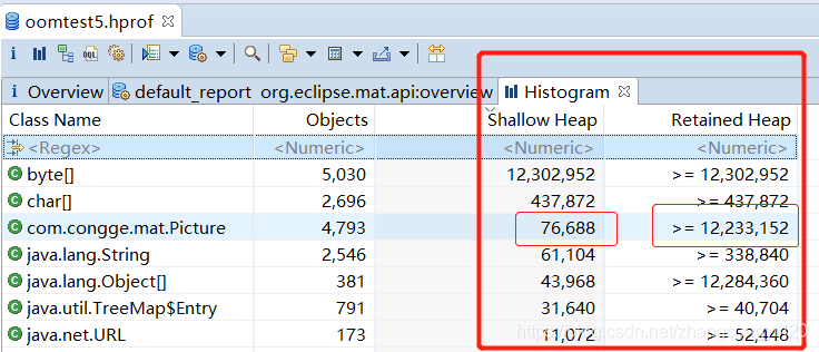在该栏,另外有2个参数值得注意,就是列举出来的Shallow Heap的数量和Retained Heap的数量,即浅堆和深堆的数量,通常来说,对某个具体的对象来说,深堆的数量是超过浅堆的数量的,这个和JVM对象的底层原理有一定关系,