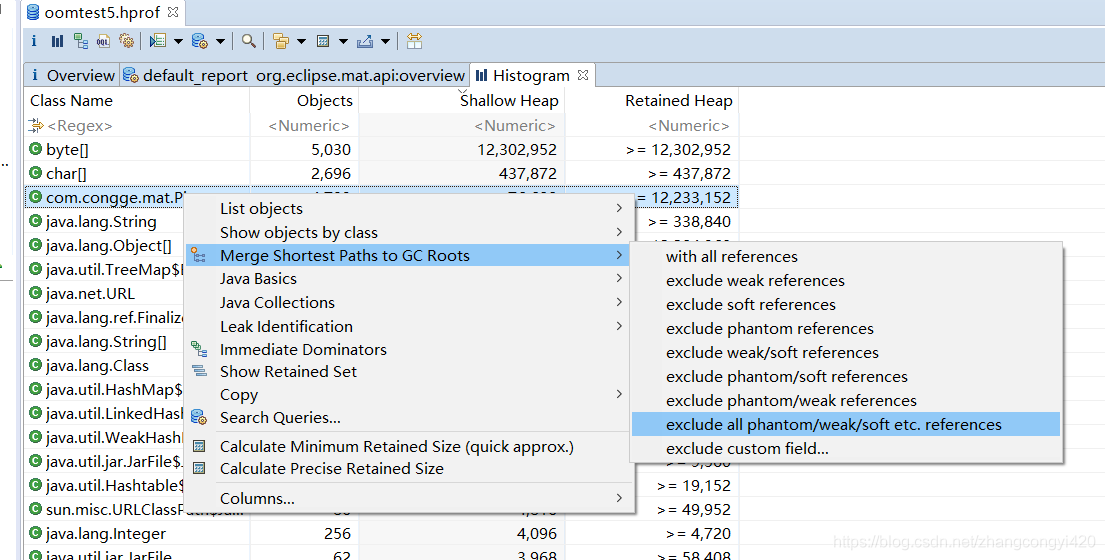 排除该对象的弱引用,虚引用,通过点击这里,只筛选出当前对象被那些对象进行了强引用,在OOM的分析中,可以对此判断是哪些对象对于该对象的引用造成了对象无法回收的情况,也是定位问题的一个很好的点
