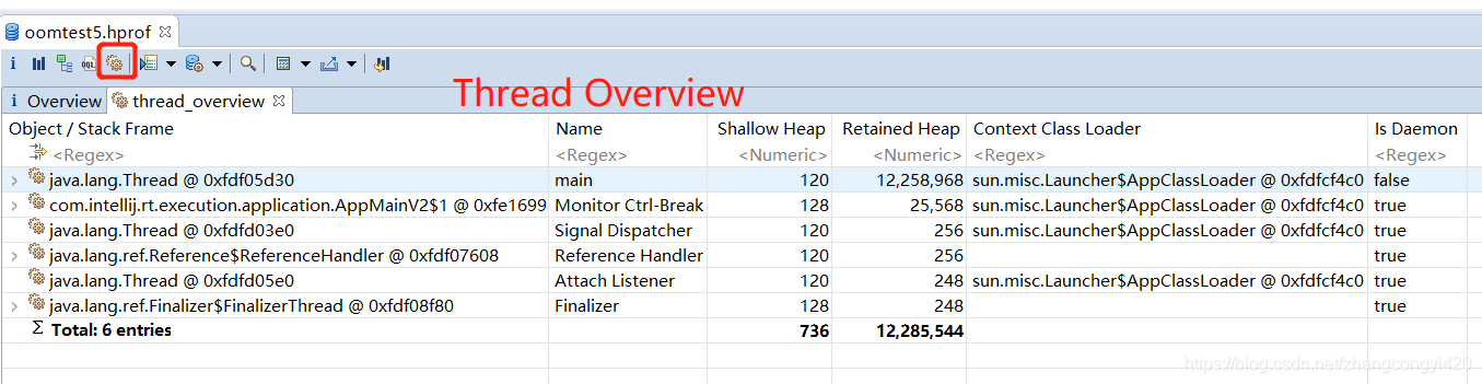点击该菜单,展示出当前dump文件中,所有的线程信息,如上图所示,展示出了所有的线程,主线程,以及各个线程中的浅堆和深堆占用的大小,类加载器,是否守护线程等信息